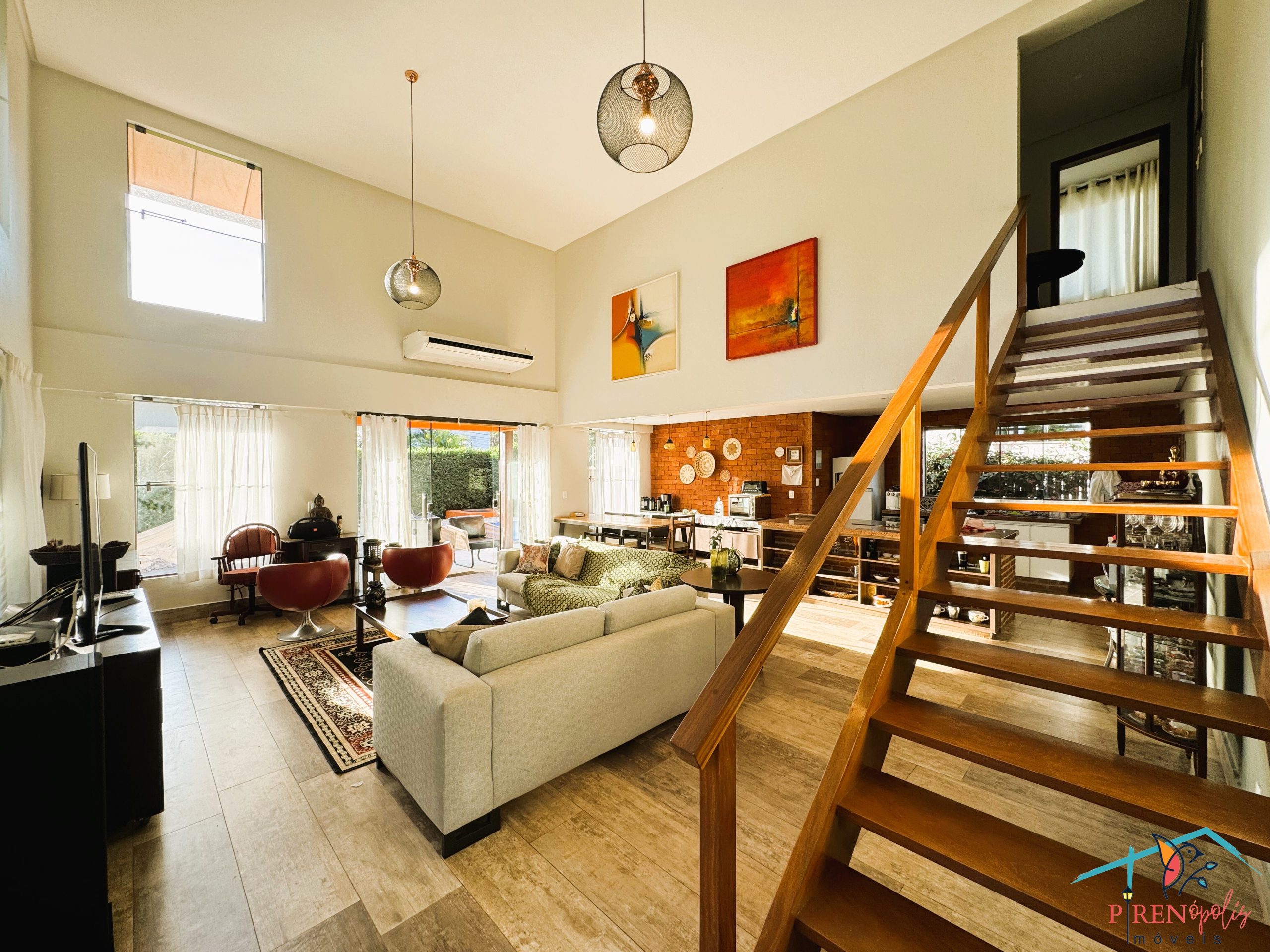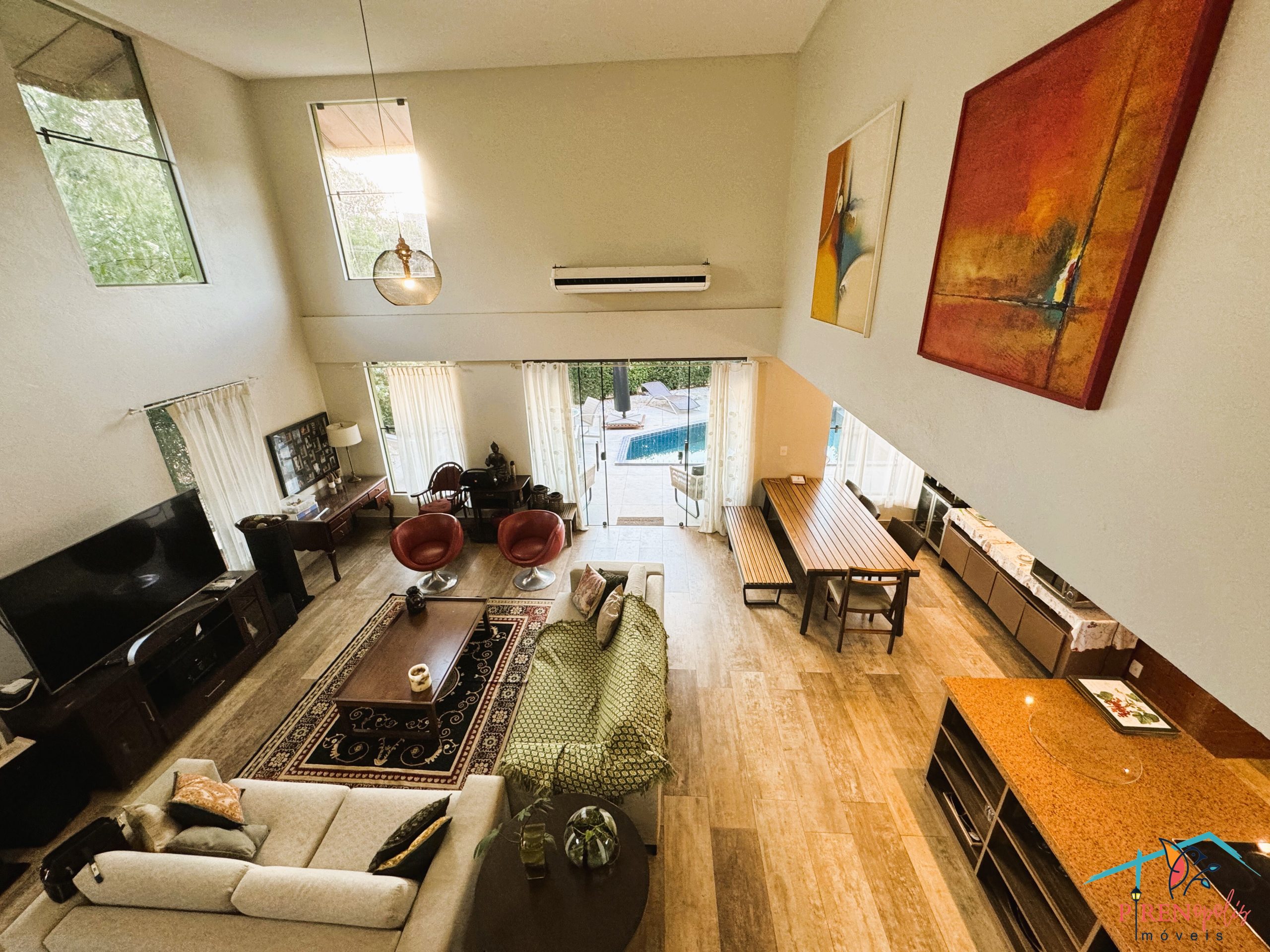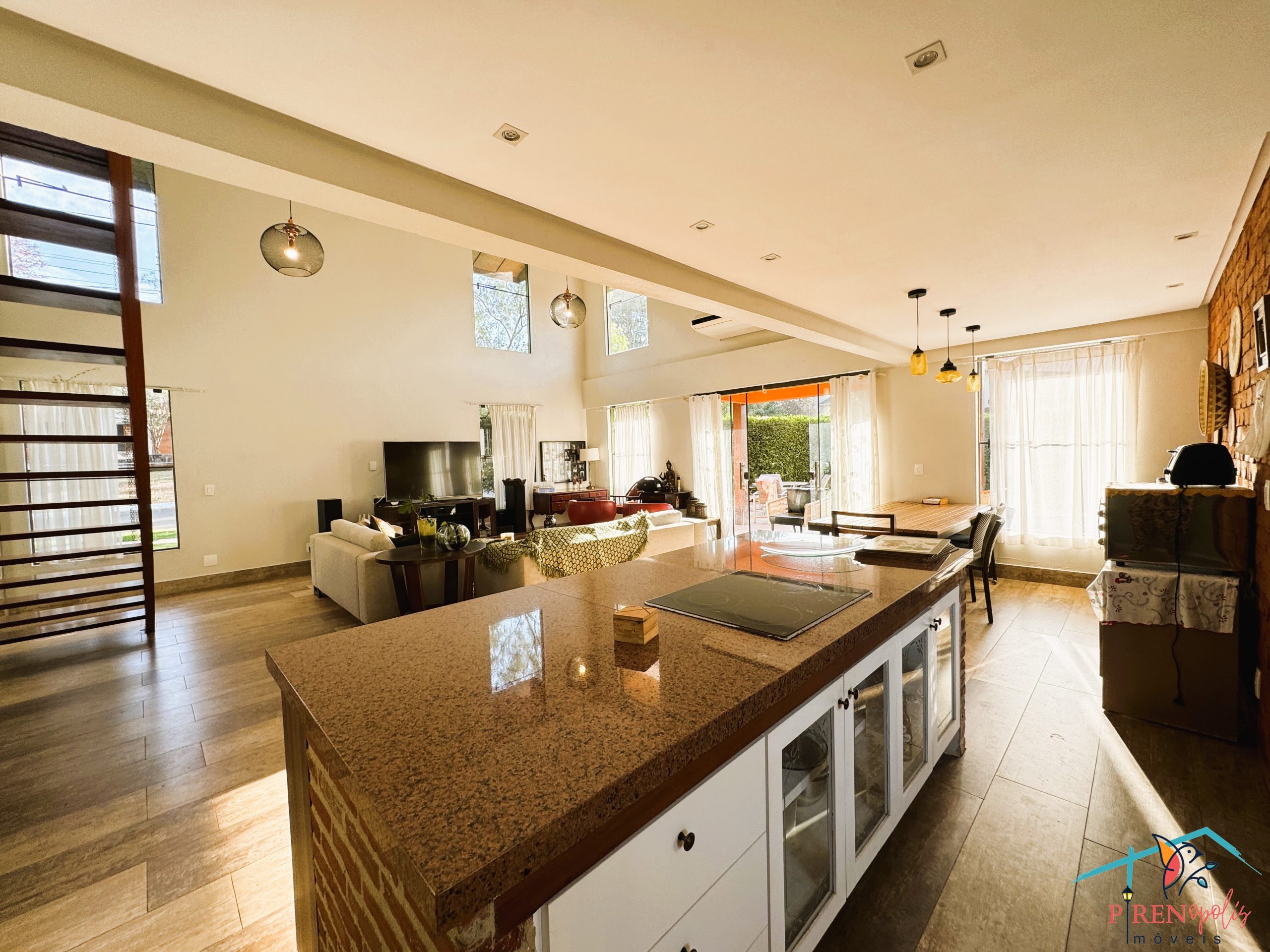 * Ambientes integrados: sala de estar, sala de jantar e cozinha compõem um único e espaçoso ambiente, com pé-direito duplo, janelas generosas e iluminação natural em abundância