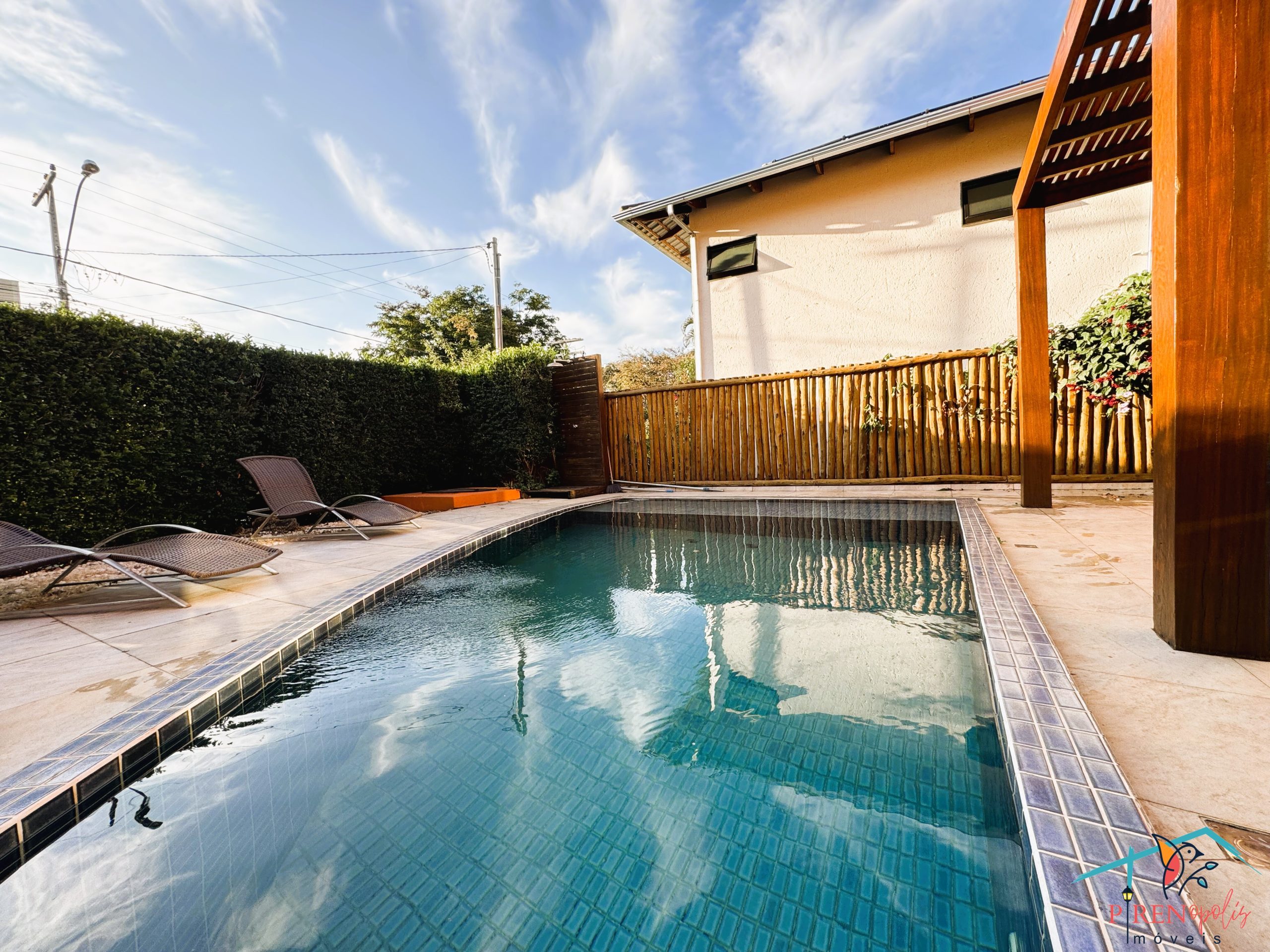 * Piscina privativa em alvenaria, com revestimento escuro que harmoniza com a paleta arquitetônica do imóvel